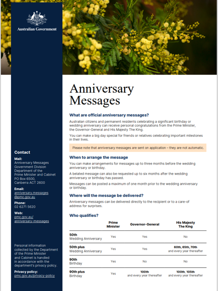 Catherine’s office can arrange for a letter from herself, the Prime Minister, Premier, Governor General and His Majesty the King (depending on the milestone).